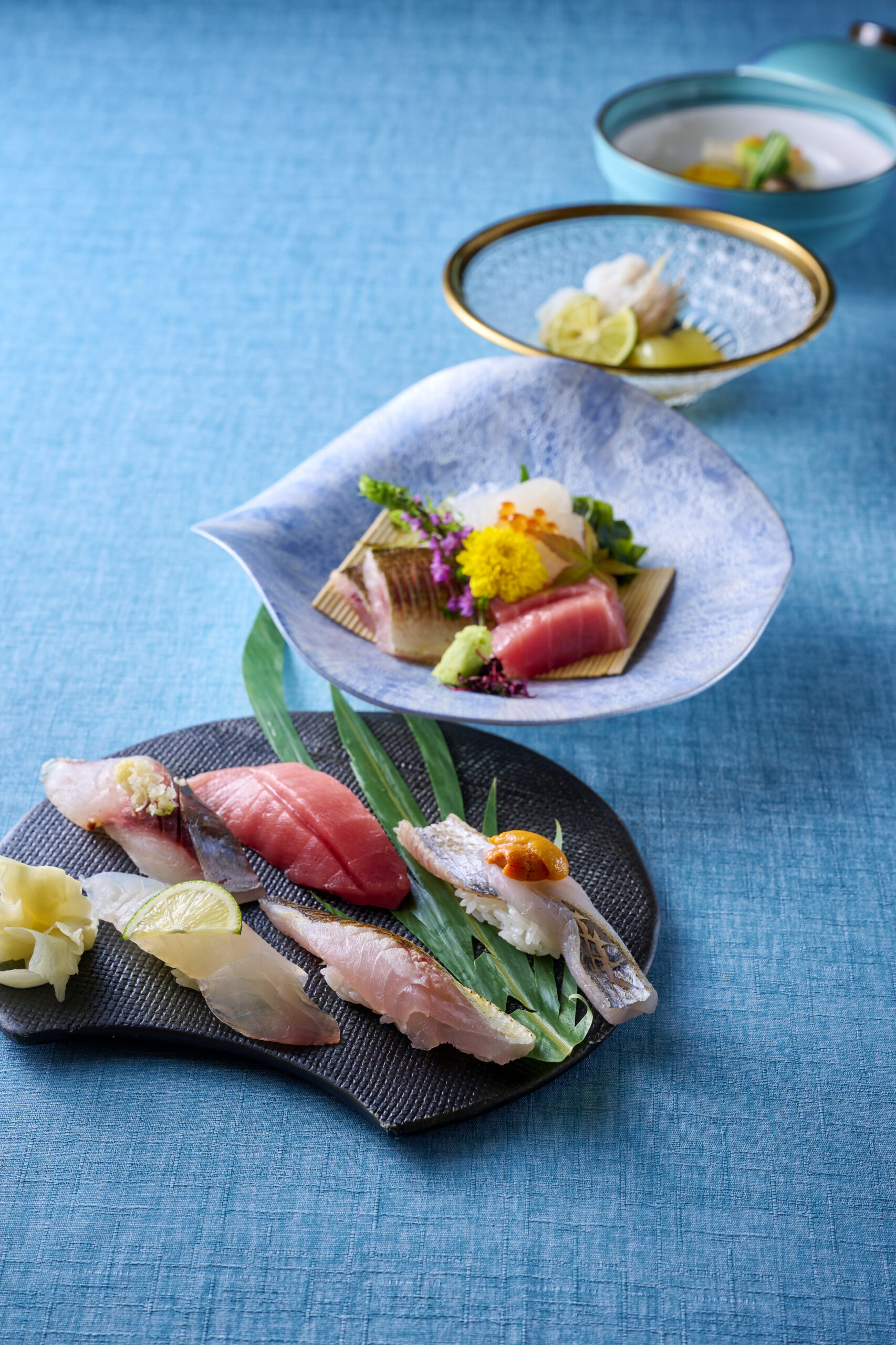 生演奏とプロジェクションマッピングが彩る館内で、淡路島の旬の海鮮を使った寿司や天ぷらなど、瀬戸内の恵みを生かした料理をご提供します。
